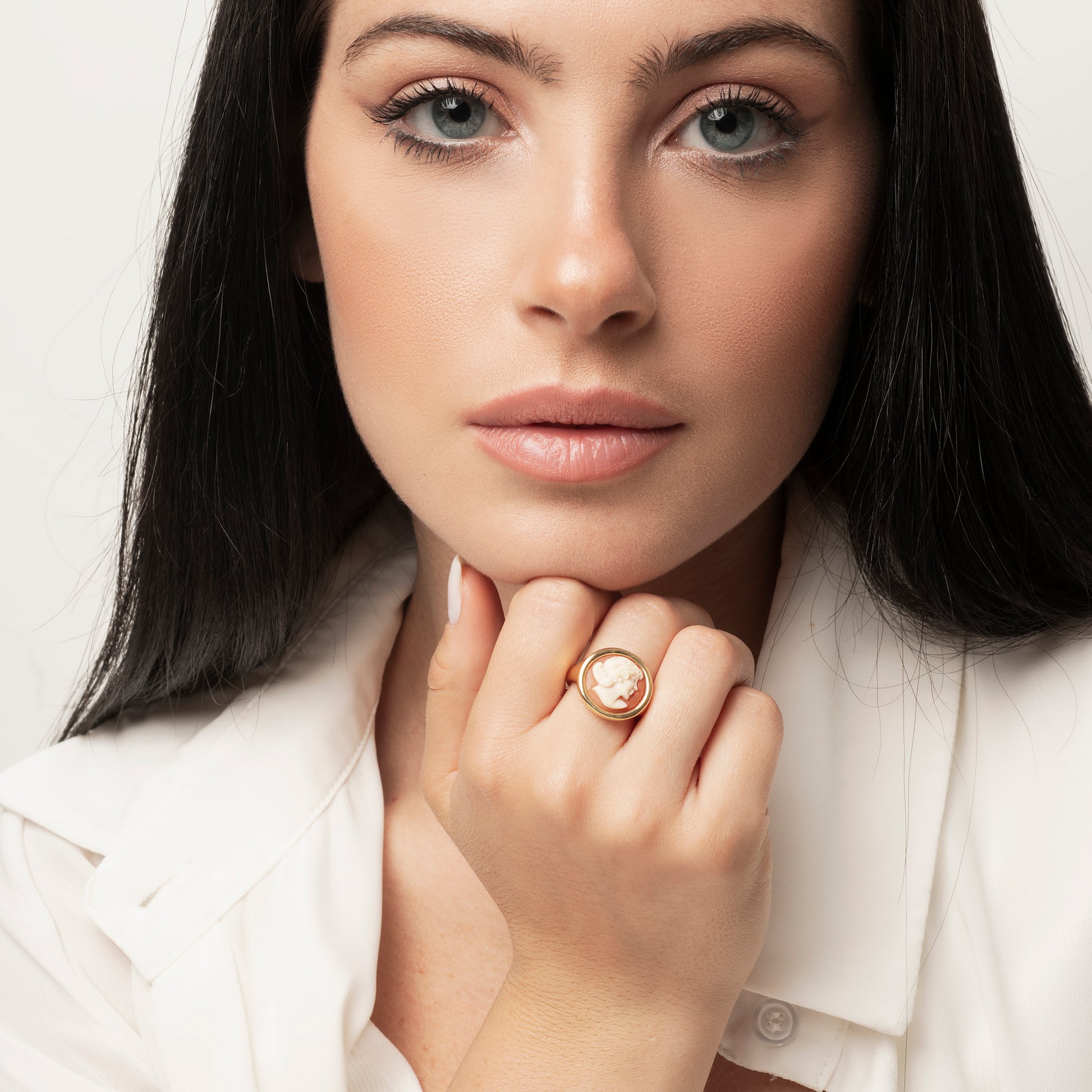 Anello realizzato in Argento 925 in due varianti di colore: placcato in Oro Giallo 18Kt o in oro rosa 18Kt e impreziosito da un cammeo inciso a mano da 13 mm, che raffigura un delicato volto di donna.