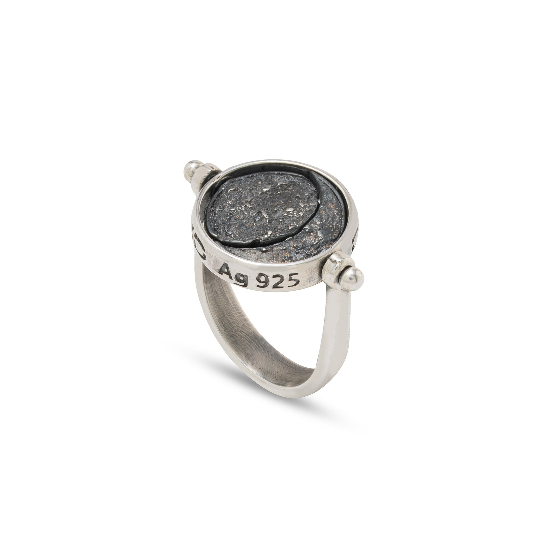 Anello in argento 925 totalmente realizzato e rifinito a mano artigianalmente, con meccanismo segreto che permette di cambiare le varie FASI lunari semplicemente ruotando l’interno dell’anello composto da due parti separate e brunite in maniera diversa così da ottenere le varie configurazioni desiderate, crescente, piena, calante e nuova.