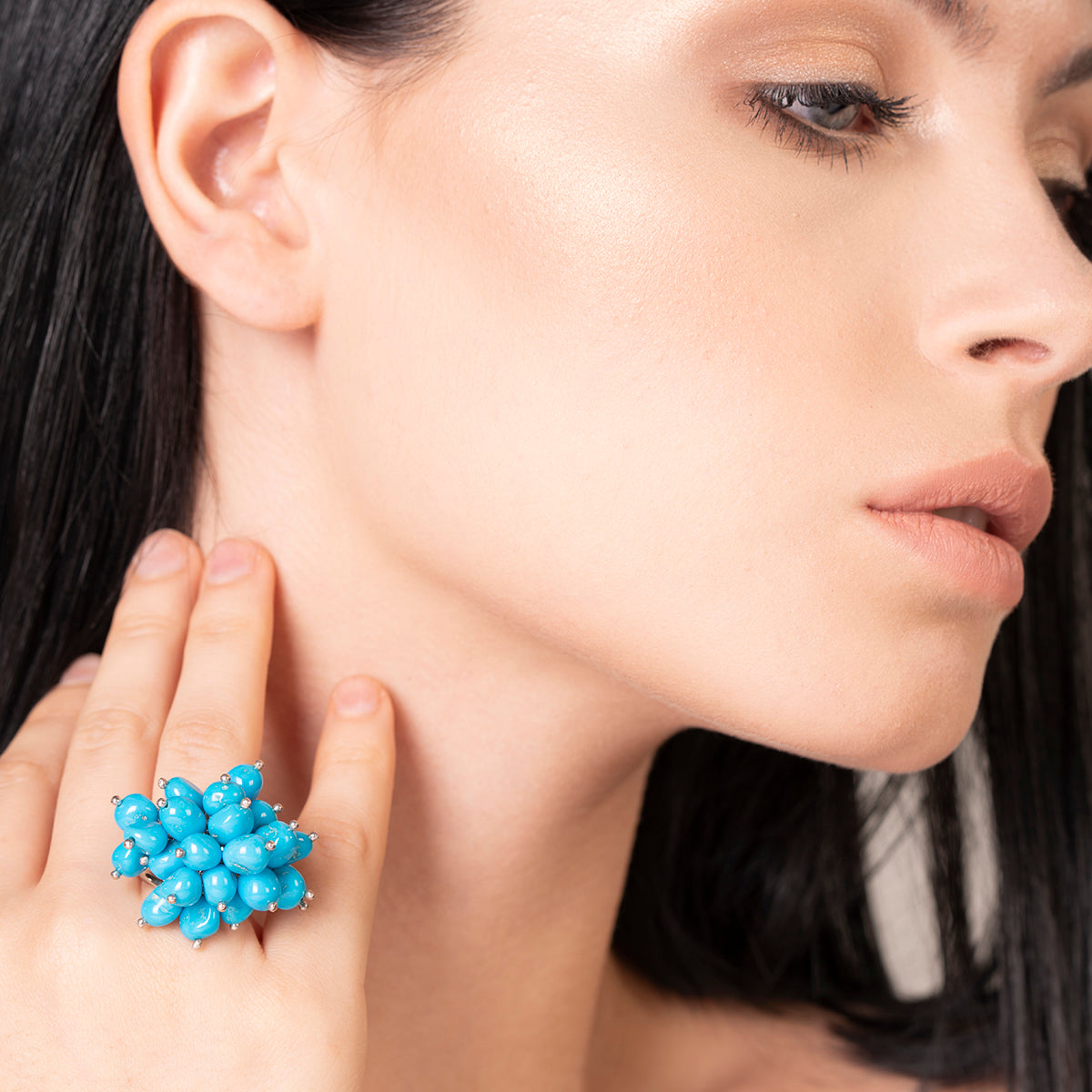 Anello regolabile, in argento 925, con ciuffo di Turchese. L'accessorio perfetto per un momento speciale. Veste dalla misura 12 alla mis 14.