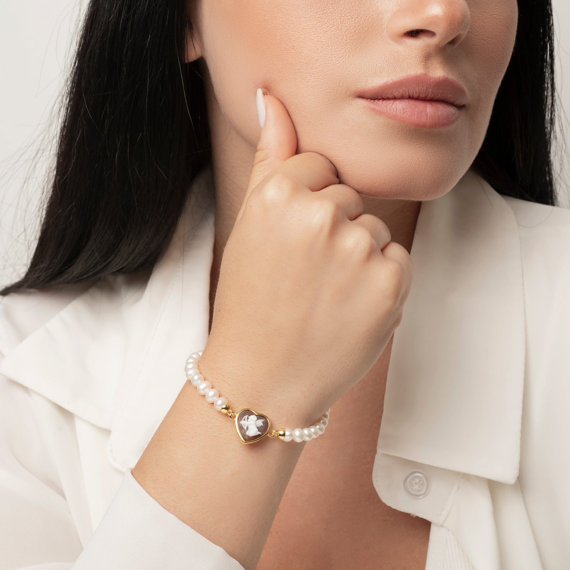 Bracciale filo di perle con cammeo centrale a forma di cuore raffigurante putto- Cameo Italiano