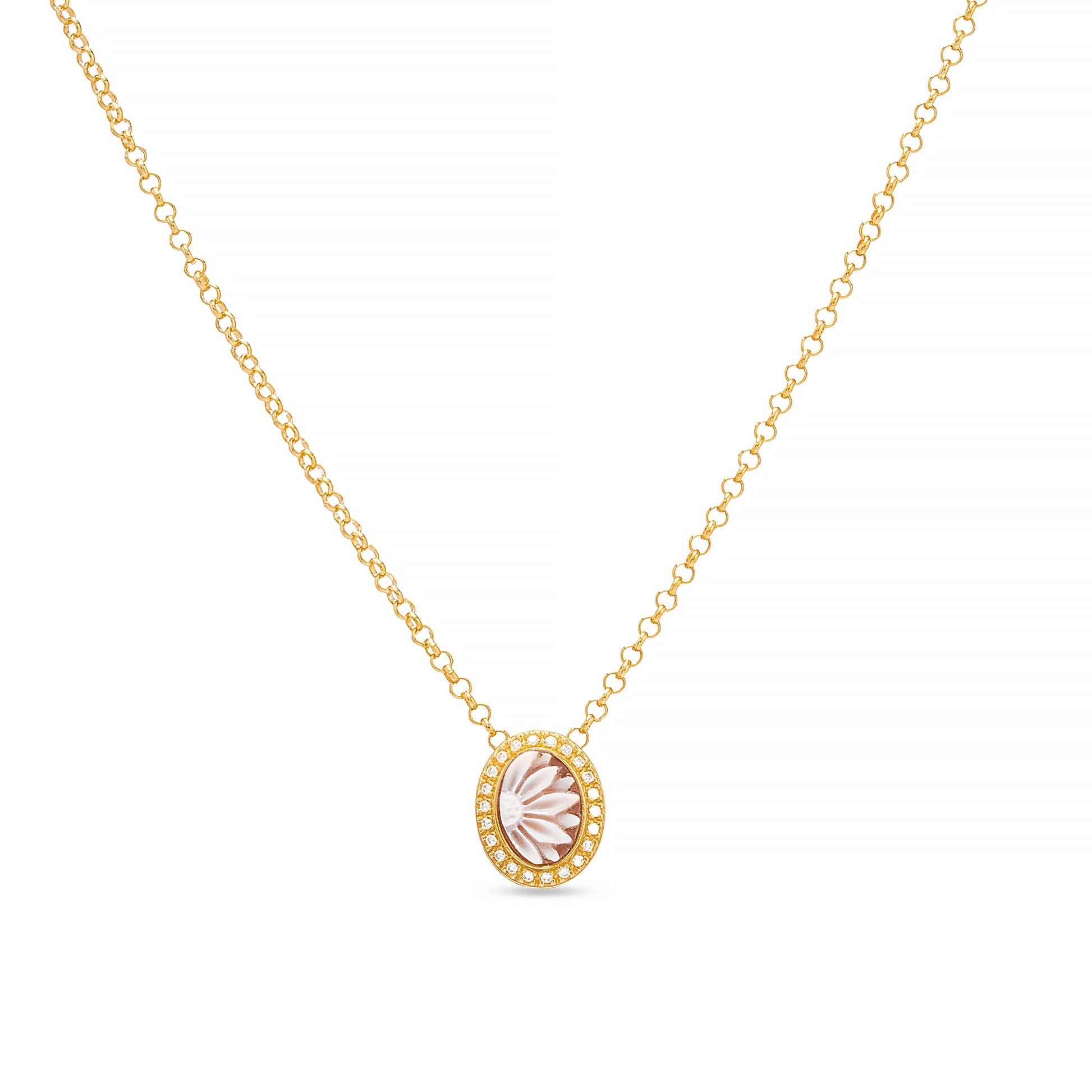Collezione Flora, collana in argento dorato con cammeo in conchiglia con inciso profilo floreale, pavè di zirconia.