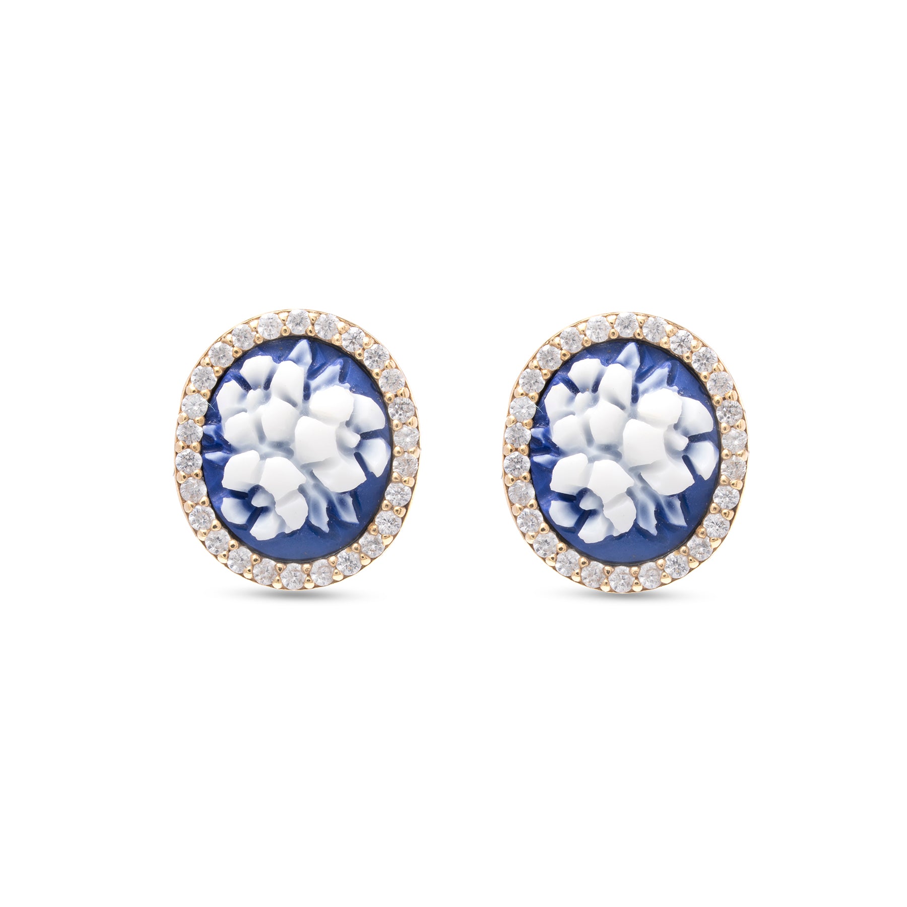 Orecchini a perno in argento 925 placcato in oro 18 kt con pietra tonda 12 mm con bouquet inciso su pietra minerale blu.