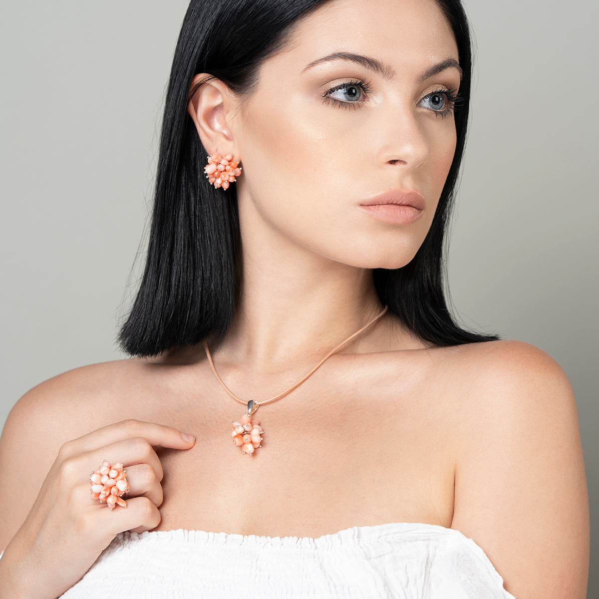 Delicati Orecchini con ciuffo di Corallo rosa montati in argento 925. Chiusura con perno e clip di sicurezza. La sfumatura più armoniosa per incorniciare il viso con eleganza.