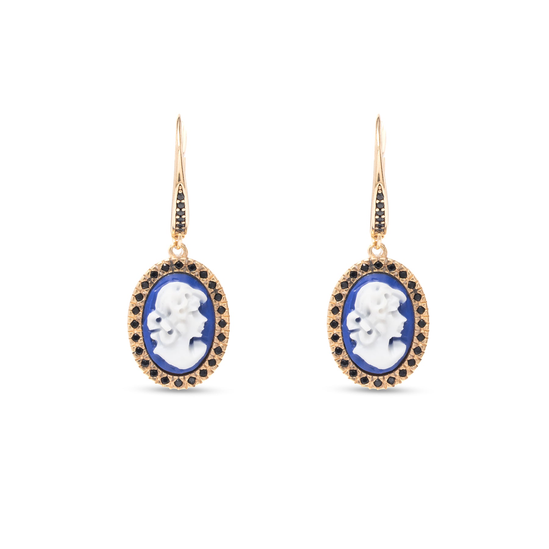 Orecchini pendenti in argento 925 placcato in oro 18 kt con cammeo raffigurante un volto di donna di 14 mm su pietra minerale blu con pavè di pietre blu.